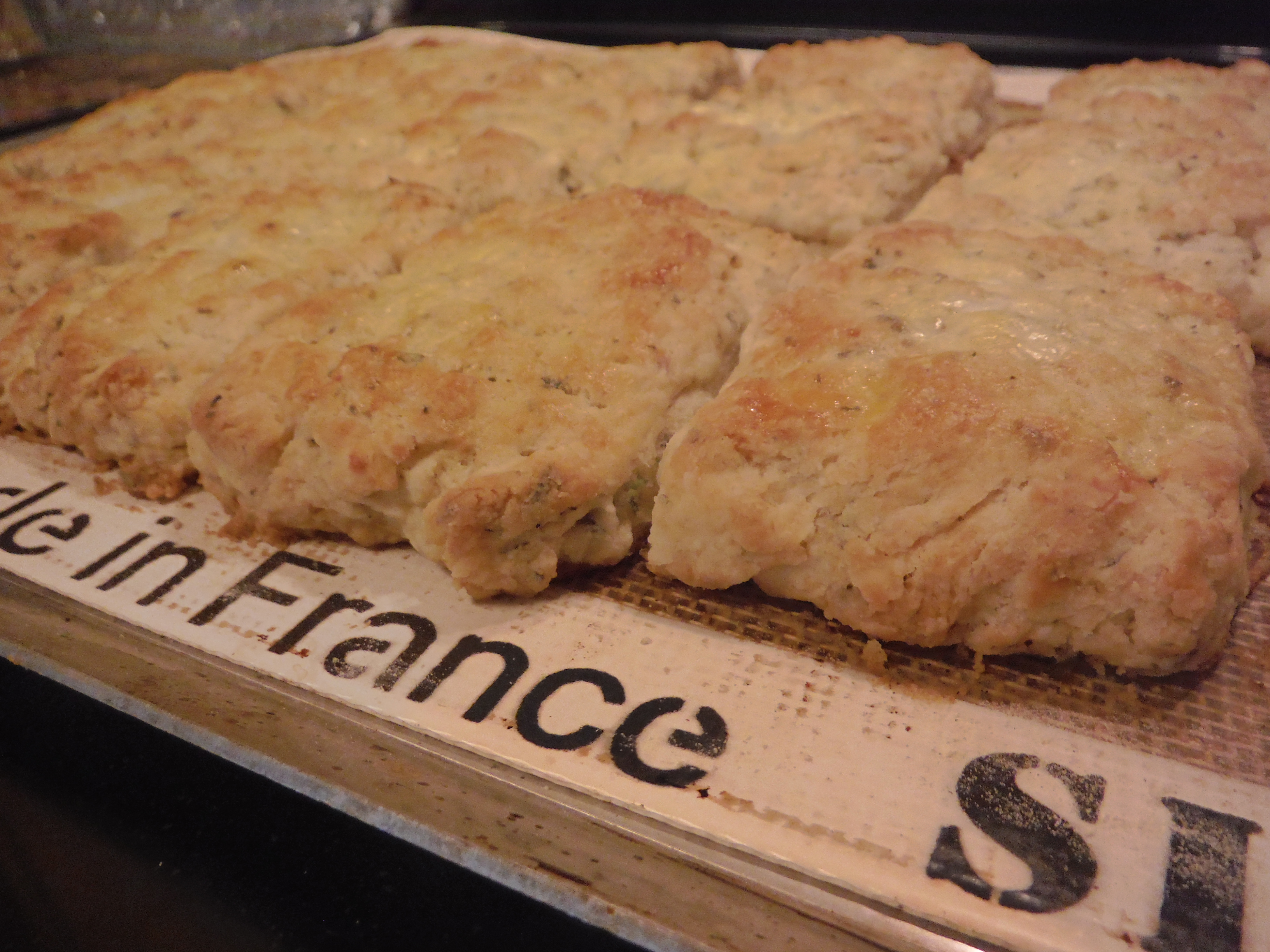 - Whisk together the flour, baking powder, salt, and herbes de Provence in a large mixing bowl. Add the cubed butter, and cut in with a pastry blender