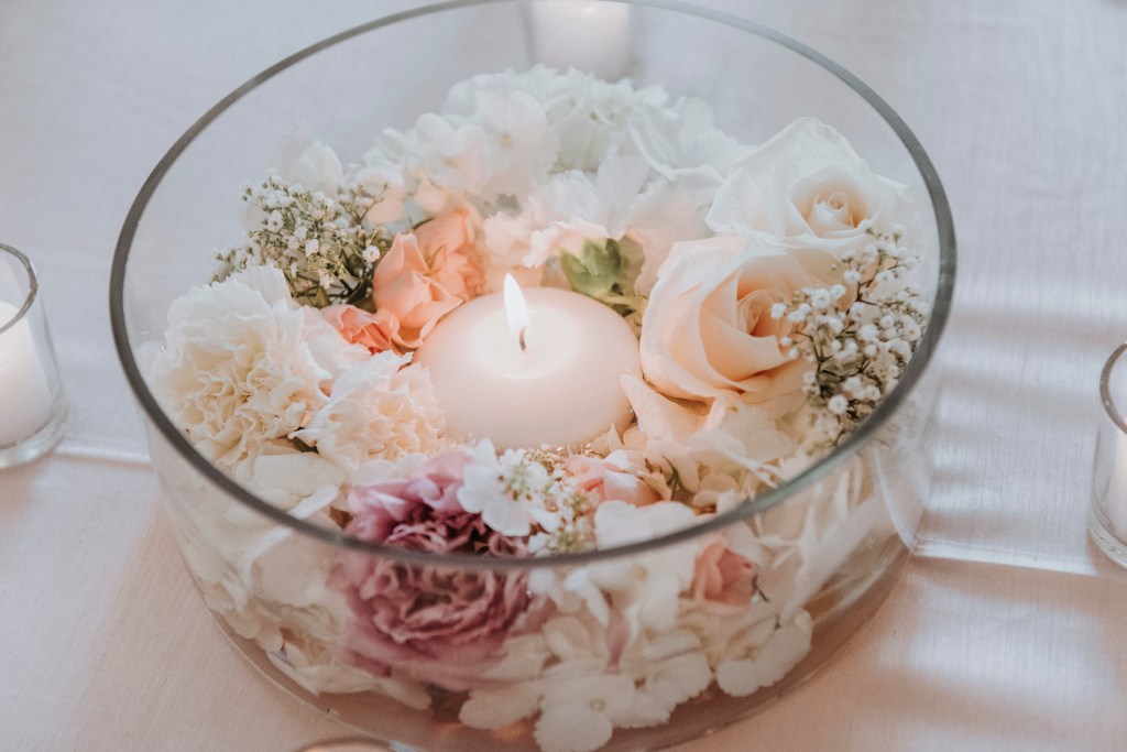 The floral design was an example of classic elegance. From blush toned garden roses to the soft white petals of hydrangeas, the variety of floral arrangements truly created a playful, yet sophisticated tablescape. I recommended Wholesale Flowers and Supplies to do the arrangements for this large event due to their impeccable floral options and prices. Designing a tablescape and setting up the decor is one of my favorite creative outlets. I suggested a variety of heights for the vases to create texture, but low enough that their guests could see over them during a conversation. The round tables were donned with floating flowers and candles in a low dish vase to create a freshly picked vibe. The bride’s bouquet also captured that provincial garden look, which looked absolutely stunning with her open lace back and chiffon bridal gown by BHLDN. The bridesmaids’ soft blush gowns complemented the bride’s gown style in complete lace or a lace bodice. The bridesmaids’ looks harmonized in tune with the romantic and idyllic theme of the event.